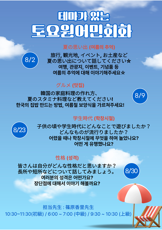| 일산일본어학원 - ♪ 2025년 7월 토요 원어민 회화 ♪ (1) | 2025.07.04 |